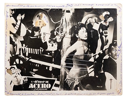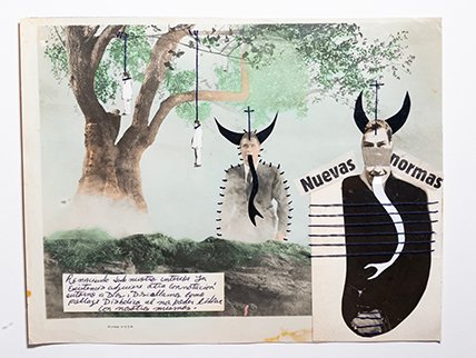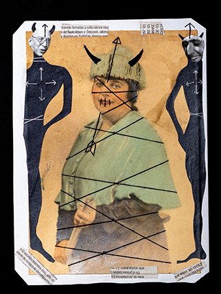 He utilizes recycled materials such as brass and wood boxes on whose exterior and interior sides he adds black and white photographs. To do this he trims and draws with a blue pen content of a sexual and diabolical nature.