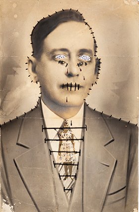 Endearing scenes become grotesque images in which the portrayed – even children – lose their faces or are characterised with devilish traits like long ears, horns or claws. Far from dealing with themes like the loss of identity, or extinctions, the faces ripped out of these characters appear in macabre ways on other parts of the composition.